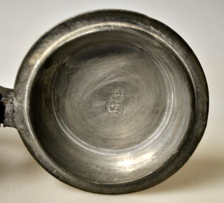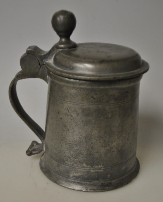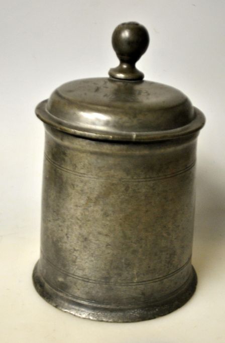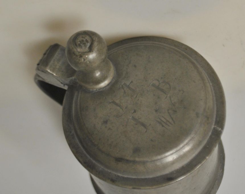 Zinnkrug, Deutschland, 1763. Konisch mit Henkel und Ausguss. Deckel gestempelt. Höhe: 16 cm. Gravuren auf dem Deckel.