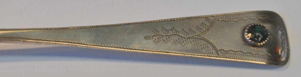 Peter Johannesen Petersen (1805–1873), Aabenraa, Dänemark: Silberlöffel mit grünen Glaseinschlüssen. Gestempelt. Länge: 23 cm. Mit Gravuren am Griff. Gravur: J. Jepsen, Eken den 9.9.1897.