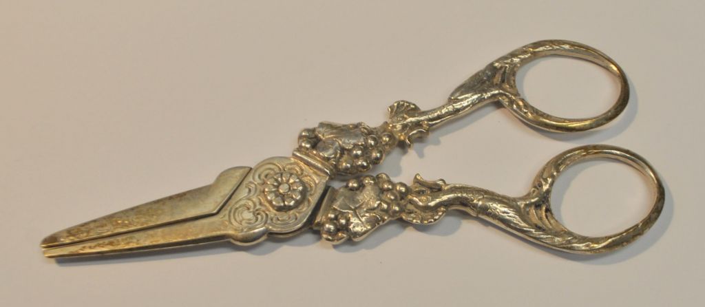Traubenschere aus Silber, 20. Jahrhundert. Punze: 800 und Meistermarken. Verziert mit einem Vogel, der Trauben frisst. Länge: 15 cm. Gewicht: 74 Gramm.