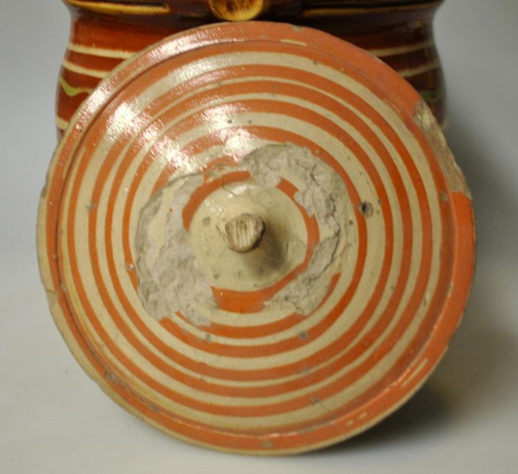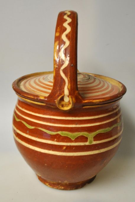 Stillkübel aus glasierter Keramik, 19. Jahrhundert. Dänemark. Mit rotbrauner Glasur und weißen und grünen Streifen. Höhe inklusive Henkel: 28 cm.
