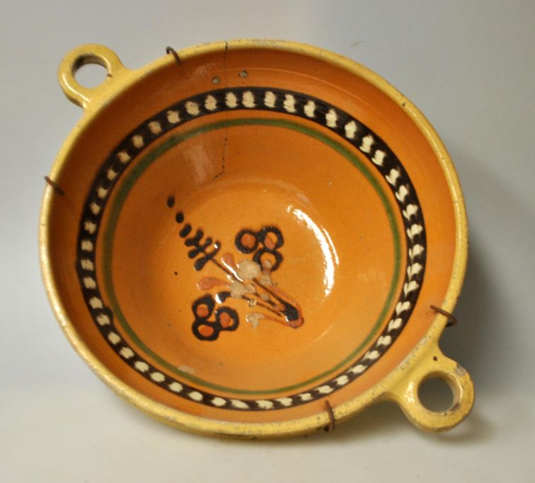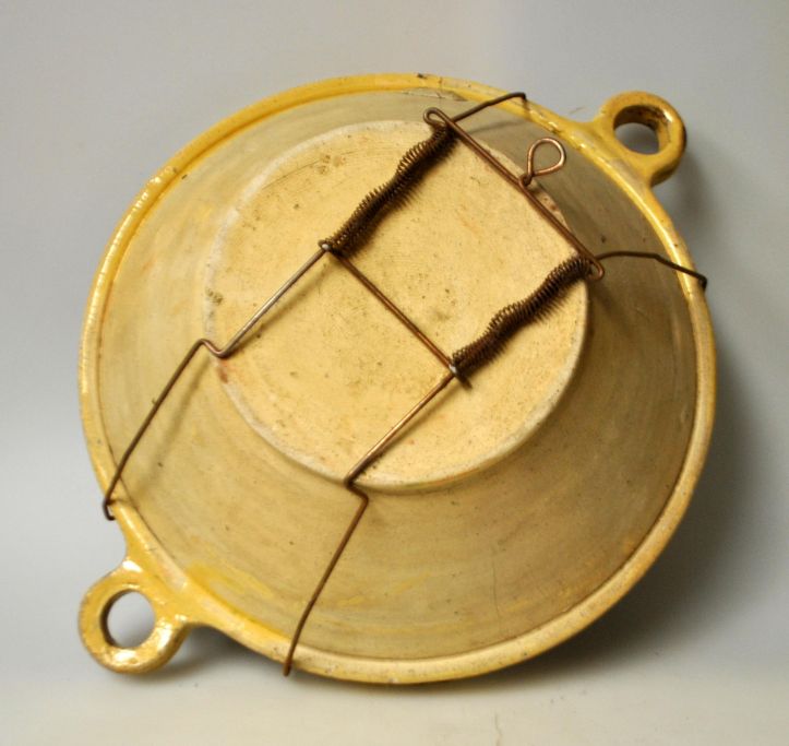 Ohrschale aus glasierter Keramik, Dänemark, 19. Jahrhundert. Gelbe Glasur mit braunen, grünen und weißen Verzierungen. Durchmesser: 24,5 cm.