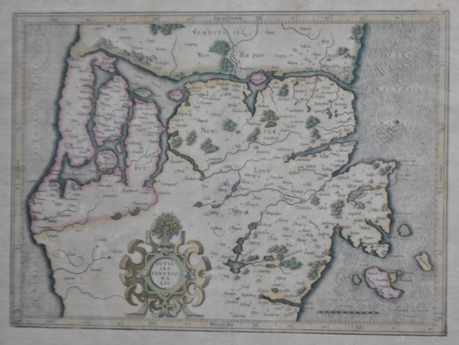 Mercator, Gerardus (1512–1594) Deutschland/Flandern: Spezialkarte von Mitteljütland. Handkolorierter Kupferstich. Signiert im Druck. Erschienen 1595. Hier: Französische Ausgabe von 1607 oder 1609. 29 × 41 cm.