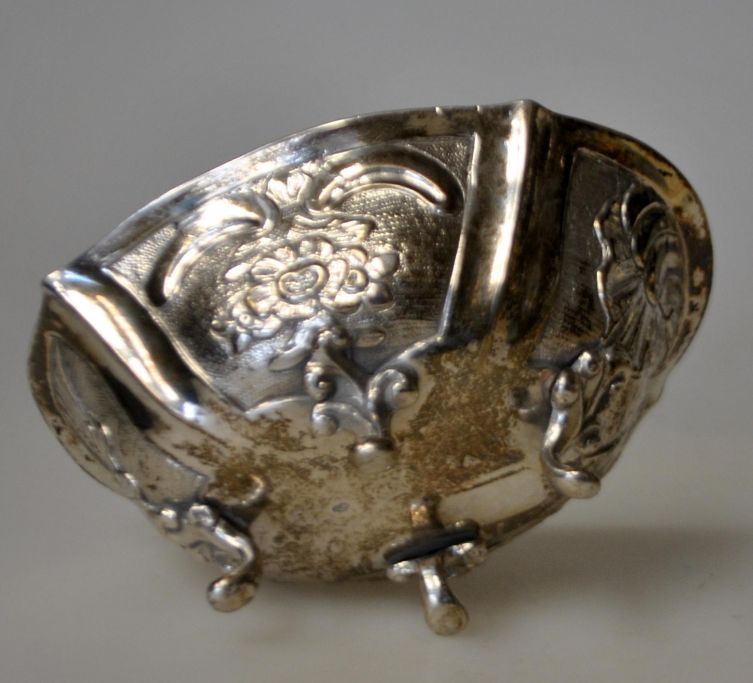 Schwedische Rokoko-Silberschale, 18. Jahrhundert. Gestempelt. Mit vier kleinen Füßen und Rokoko-Verzierungen an den Seiten mit Blumen und Rokokomotiven. Höhe: 4,5 cm. Länge: 9,2 cm.