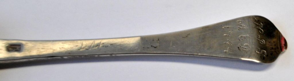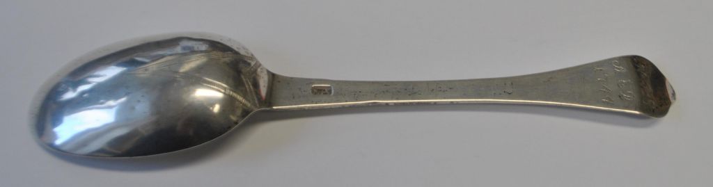 Dänischer Silberschmied (18. Jahrhundert): Silberlöffel „Rattenschwanz“. Mit Gravuren: NPS – AED 1744. Meistermarke undeutlich. Länge: 19,5 cm. Gewicht: 34 Gramm.