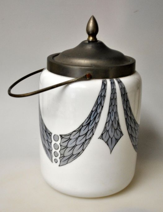 Keksdose, Fyns Glasværk, opalweißes Glas mit eingebranntem Dekor, 1910. Nr. 2287/429. Dekor mit Kontur als Transferbild. Mit Metallbeschlägen aus versilbertem Nickel mit Griff und Deckel. Höhe inkl. Deckel: 21 cm. Durchmesser: 12,5 cm.
