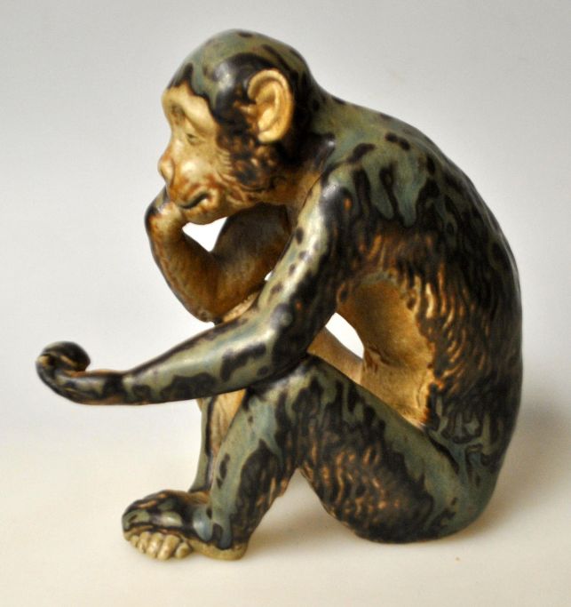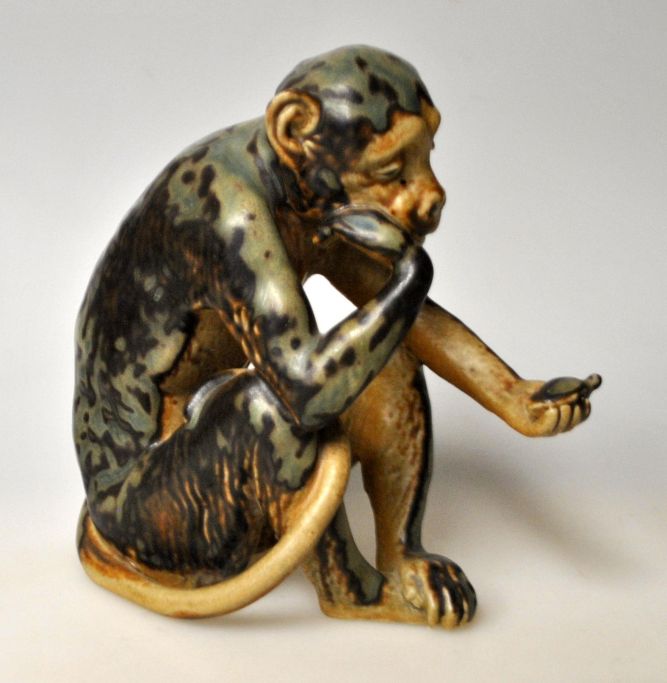 Figur von Bing & Grondahl, 20. Jahrhundert. Kopenhagen, Dänemark: Ein Affe mit einer Schildkröte. Nr. 1510. Steinzeug. Gebrannte Glasur. Gestempelt. Höhe: 13,5 cm. Entwurf: Dahl Jensen.