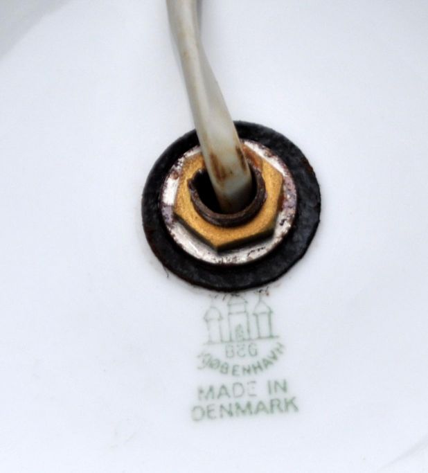 Bing & Grondahl Heiberg Tischleuchte aus Porzellan, 20. Jahrhundert. Kopenhagen, Dänemark. Mit Messingbeschlägen. Höhe mit Fassung: 52,5 cm. Geschenk von Volkswagen, Dänemark. Entsprechender Stempel vorhanden. Lampenschirm: Höhe: 31 cm, Durchmesser: 35 cm.