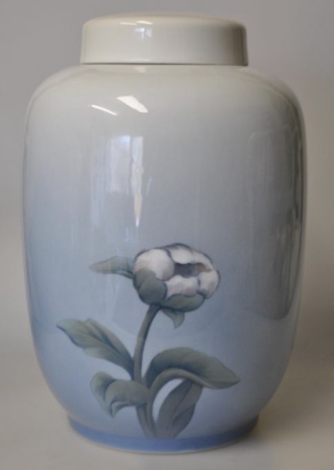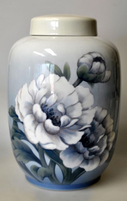 Porzellangefäß mit Deckel, Royal Copenhagen Nr. 92/888, 20. Jahrhundert. Kopenhagen, Dänemark. Mit Pfingstrosen verziert. Gestempelt. Höhe: 25 cm. Durchmesser: 17 cm.