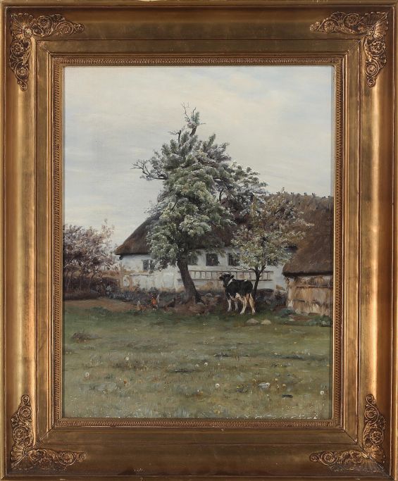 Mols, Niels Petersen (1859 - 1921) Dänemark: Grundstück von einem Bauernhof mit Hühnern und einer Kuh.