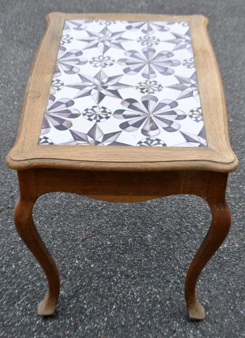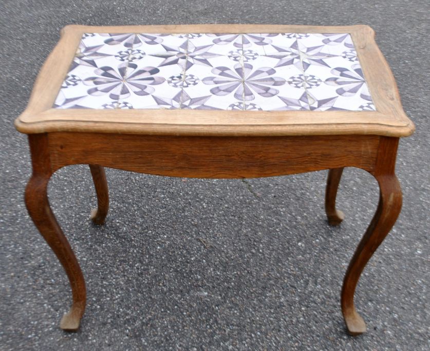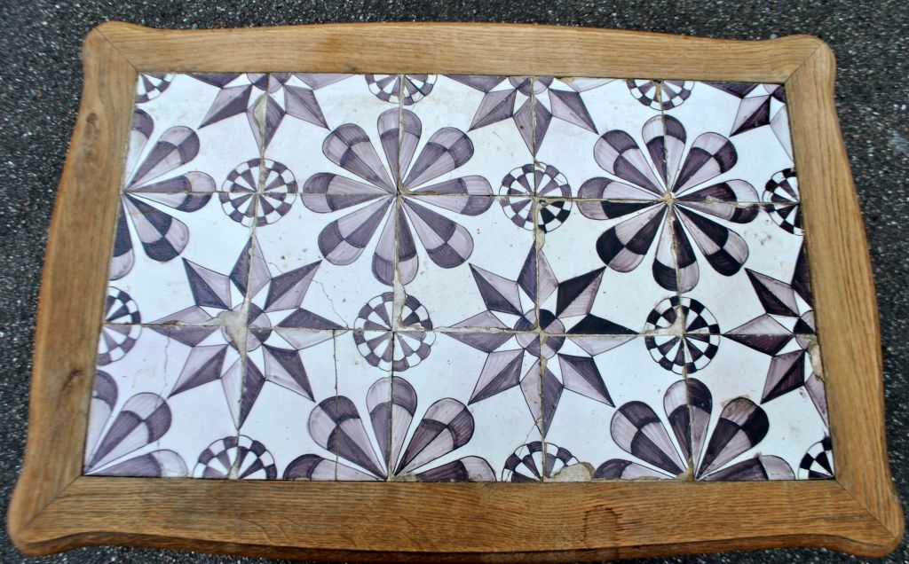 Fliesen Eichentisch im Barockstil, 20. Jahrhundert. Dänemark. H: 60 cm. L: 78 cm. B: 53 cm. 15 originale Sternfliesen aus Mangan aus der zweiten Hälfte des 18. Jahrhunderts, Friesland.