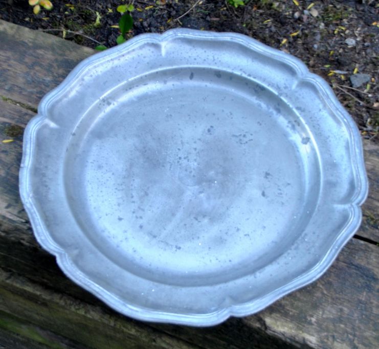 Große Zinnschale im Rokokol aus dem 18. Jahrhundert. Durchmesser: 37 cm. Keine sichtbaren Stempel.