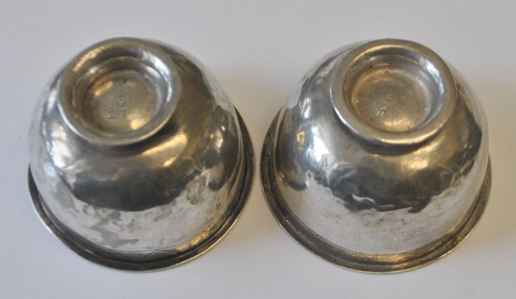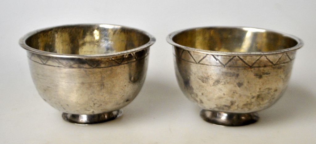 Paar schwedische Silberbecher, Peter Neiindorff, Lidköping (1797–1835). Am Ständerrand. Mit Verzierungen am Becken. Gestempelt. Höhe: 4 cm. Durchmesser: 6 cm.