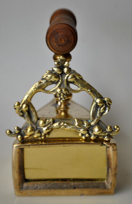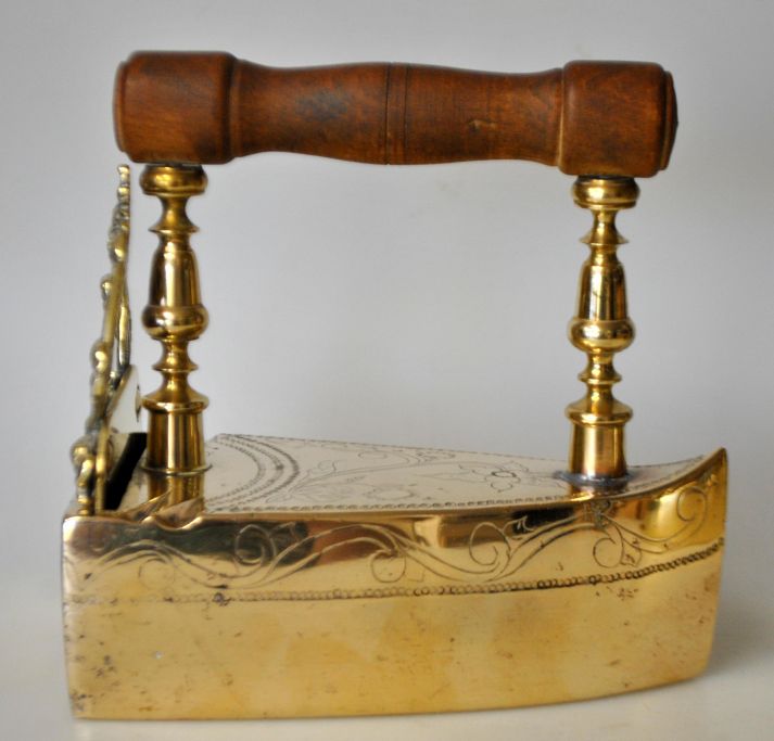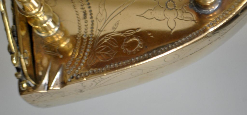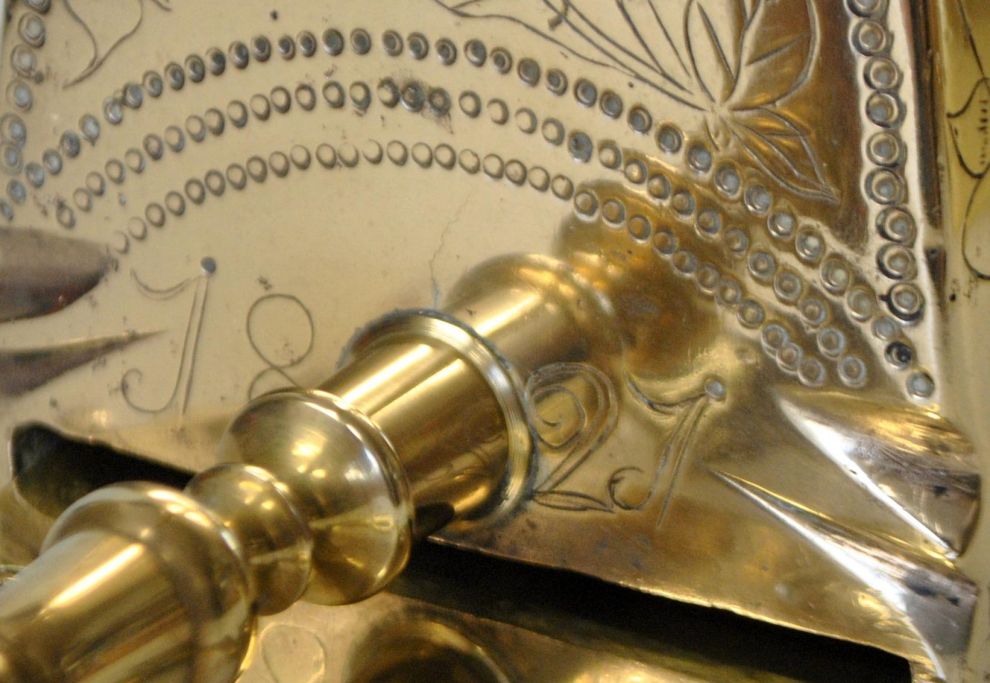 Antikes Eisen- und Messinggefäß, Dänemark, 1821. Mit Holzgriff. Mit floralem Dekor und Jahreszahl. Heckklappe mit Weinranken verziert. Höhe: 14,5 cm. Länge: 15,5 cm.