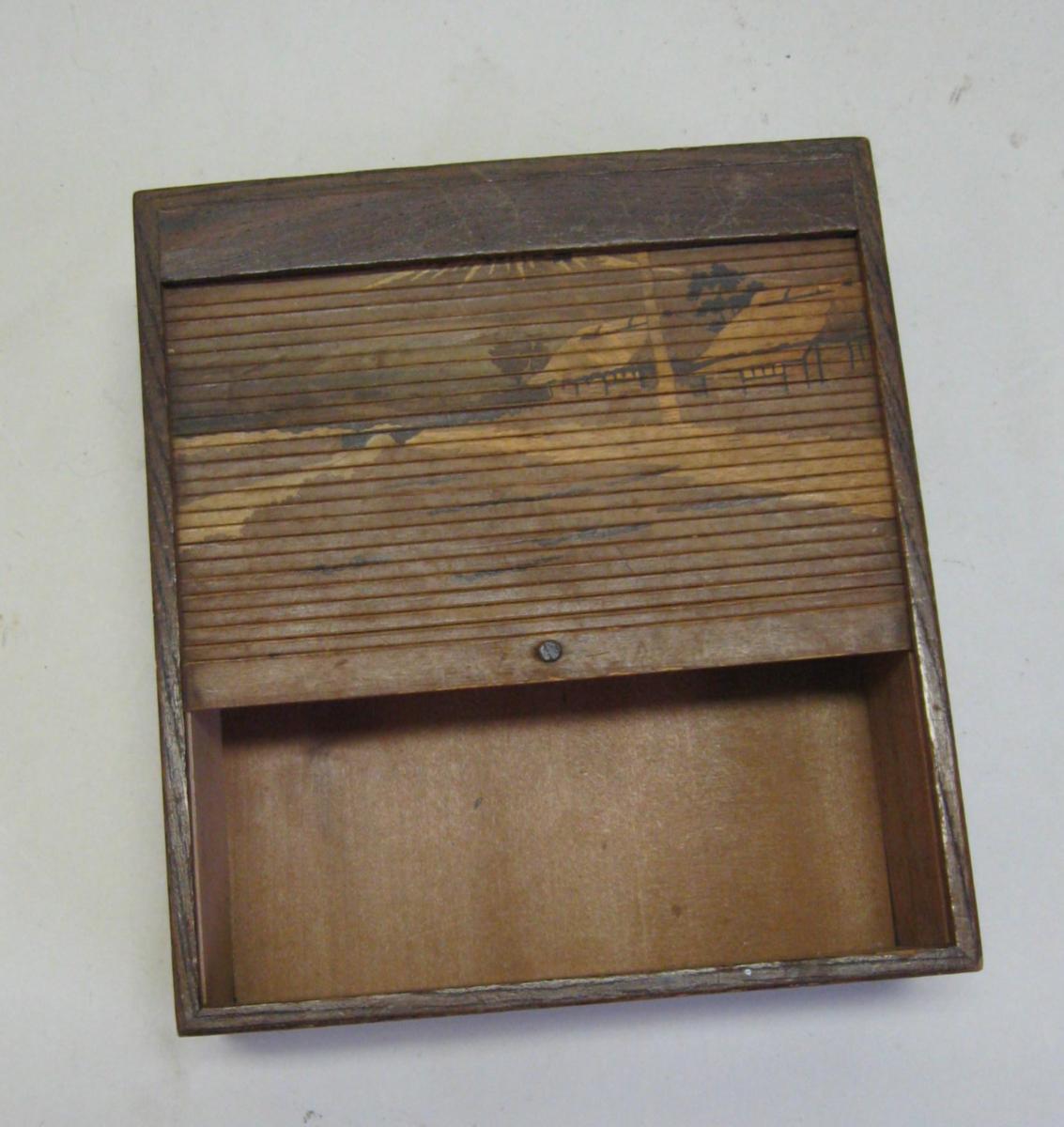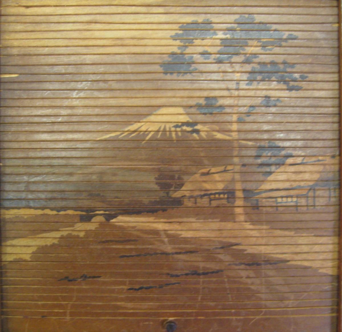 Japanische Schrein, ca. 1900, aus dunklem Holz mit den Einlage an den Seiten in der Form von Blättern. Gleitverschlüsse mit eingravierten Motiven von under anderem ein Landschaft und Futijama. H:. 19,6 cm. B:. 17,5 cm. D:. 6,5 cm.