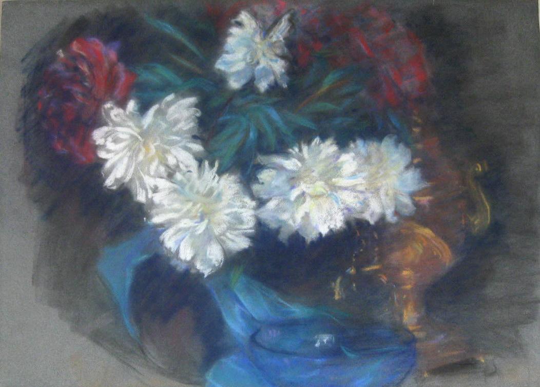 Dänische Künstler (19. Jh.): Große Glasschüssel mit Blumen und Samowar. Pastellkreiden auf Papier. Unsigned.