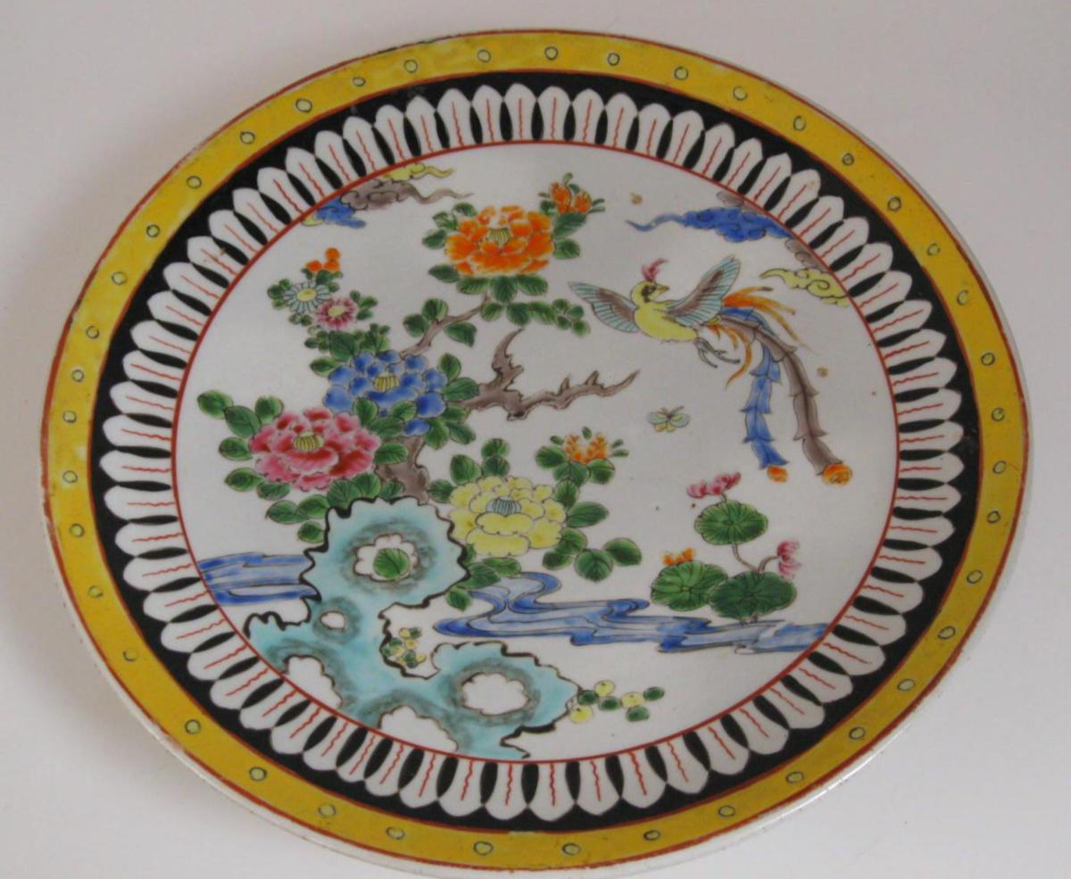 Japanisches Gericht in Porzellan, c. 1900. Polychromie mit Blumen, Vögeln usw. Gestempelt. Dia:. 31 cm.
