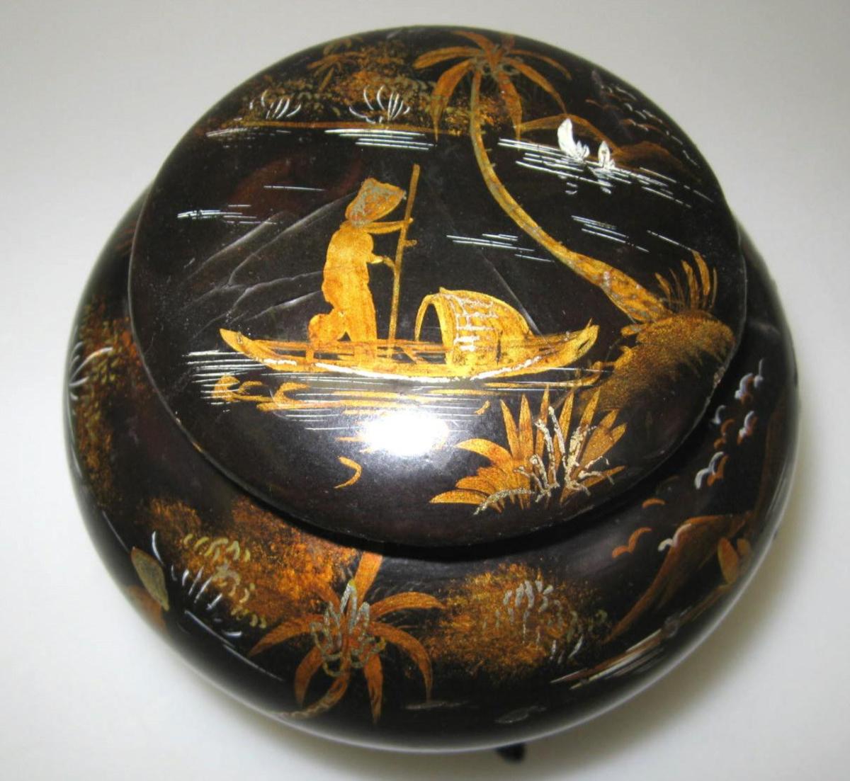 Chinesische schwarze Lackdose auf drei Beinen mit Deckel, 19. Jh. Dekoriert mit kleinen Booten auf einem Fluss zwischen Bergen. Versilbert. H:. 13 cm. Dia:. 12 cm.