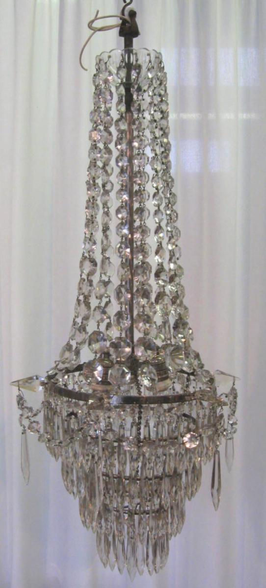 Kristall-Kronleuchter, ca.1900. H:. 85 cm. Dia:. 35 cm. Insgesamt 497 Prismen. Mit drei Glühbirnen.