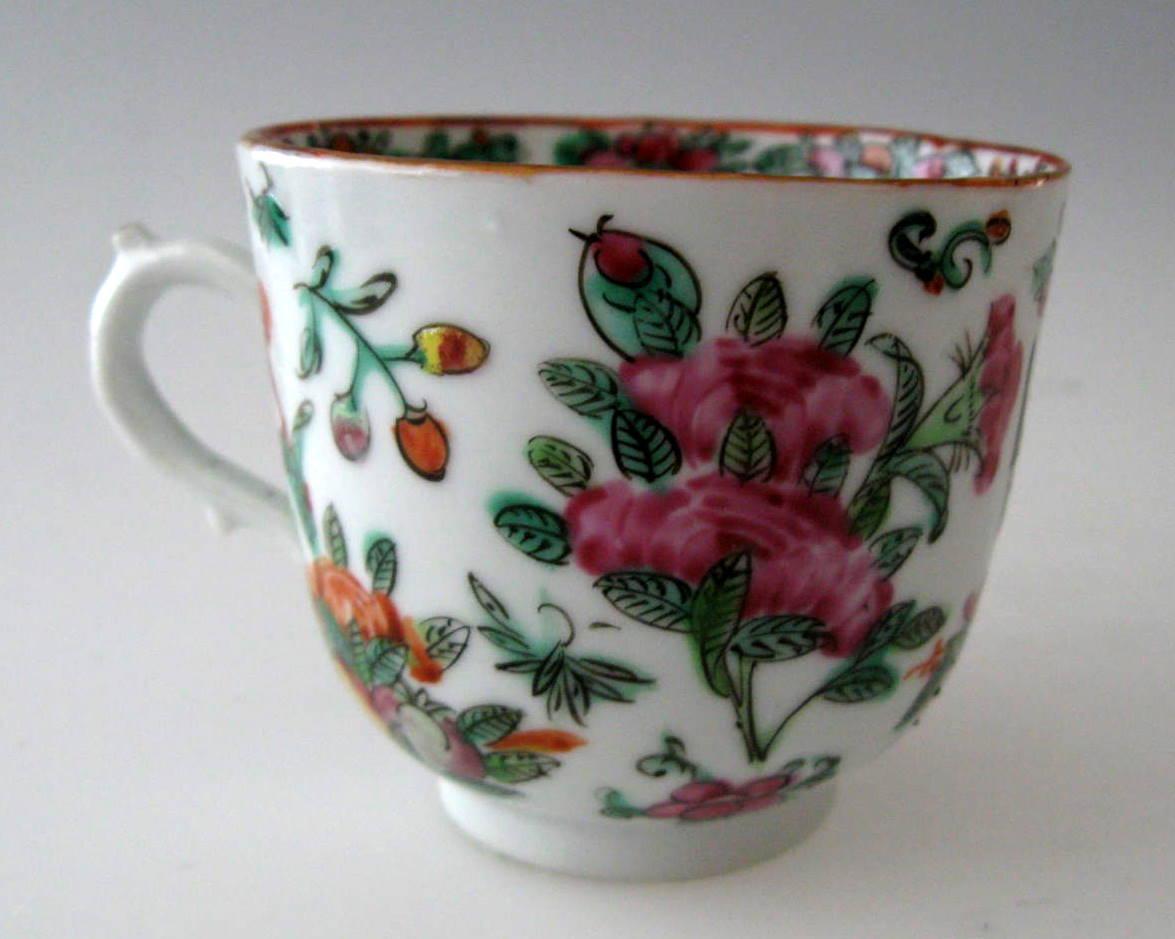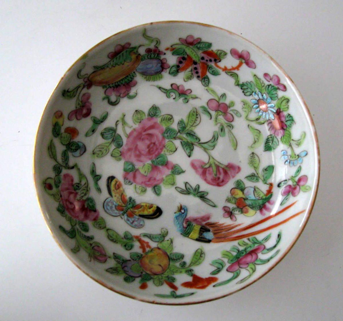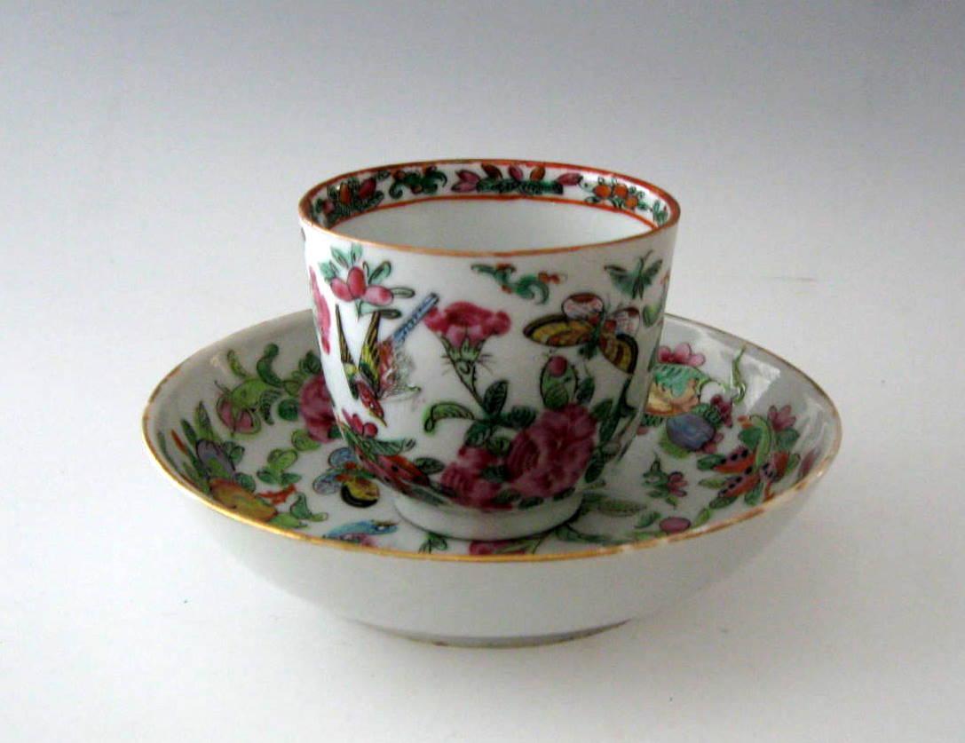 "Famille Rose" Tasse, China, 19. Jahrhundert. Mit Untertasse. Polychrome Dekoration mit Rosen, Vögel und Insekten. H.: Tasse: 6,5 cm. Dia. Untertasse.: 13 cm.
