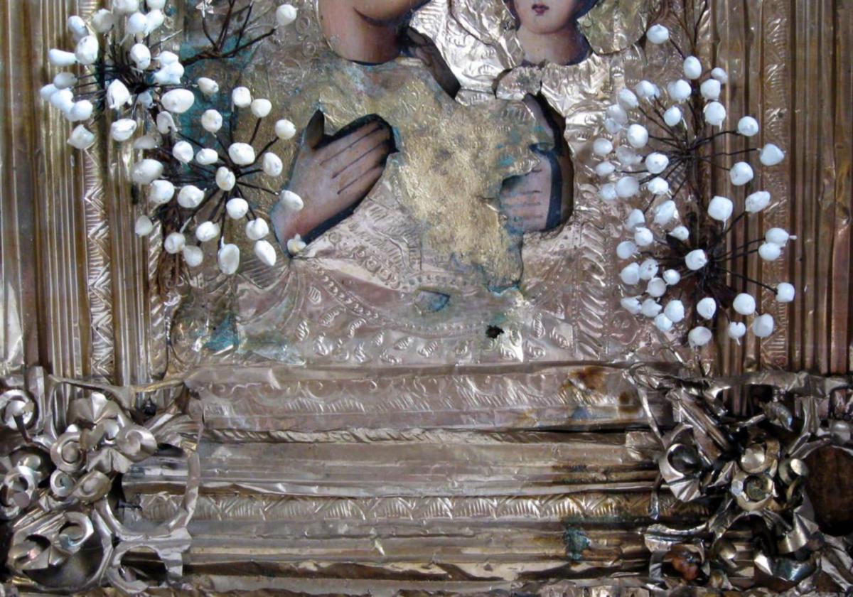 Russische Ikone, 19. Jahrhundert. Die Jungfrau und das Kind. Haltet das Kind in der linken Hand. Mit Heiligenschein aus Zinn Silber. Mit lackierten Fruchtkörper. In dem entsprechenden Box aus Holz. 35 x 30 cm. D:. 10 cm.