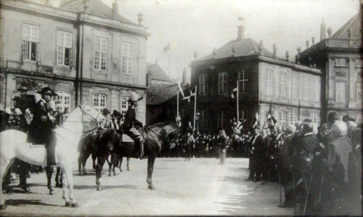 Foto vom Schloss Amalienborg, Kopenhagen. Die Veteranen aus dem Ersten Weltkrieg im Jahr 1914 auf Amalinborg Platz. Unter anderem sieht mann König Christian X, Prinz Valdemar und Peter Andreas Heiberg Jürgensen. 14 x 22 cm.