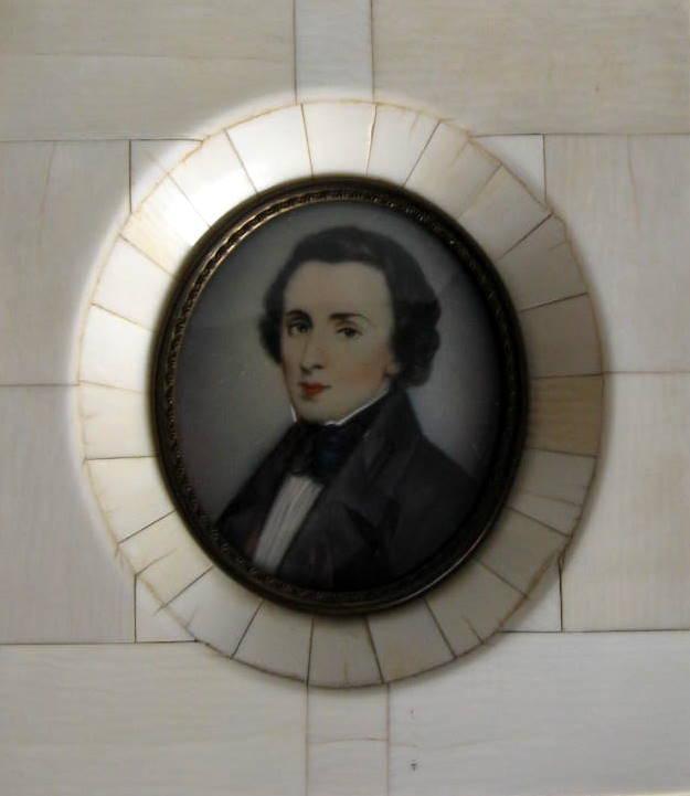 Unbekannter Miniaturkünstler, 19/20. Jahrhundert: Portrait von Frédéric Chopin. Mit Rahmen aus Bein. 12 x 11 cm.