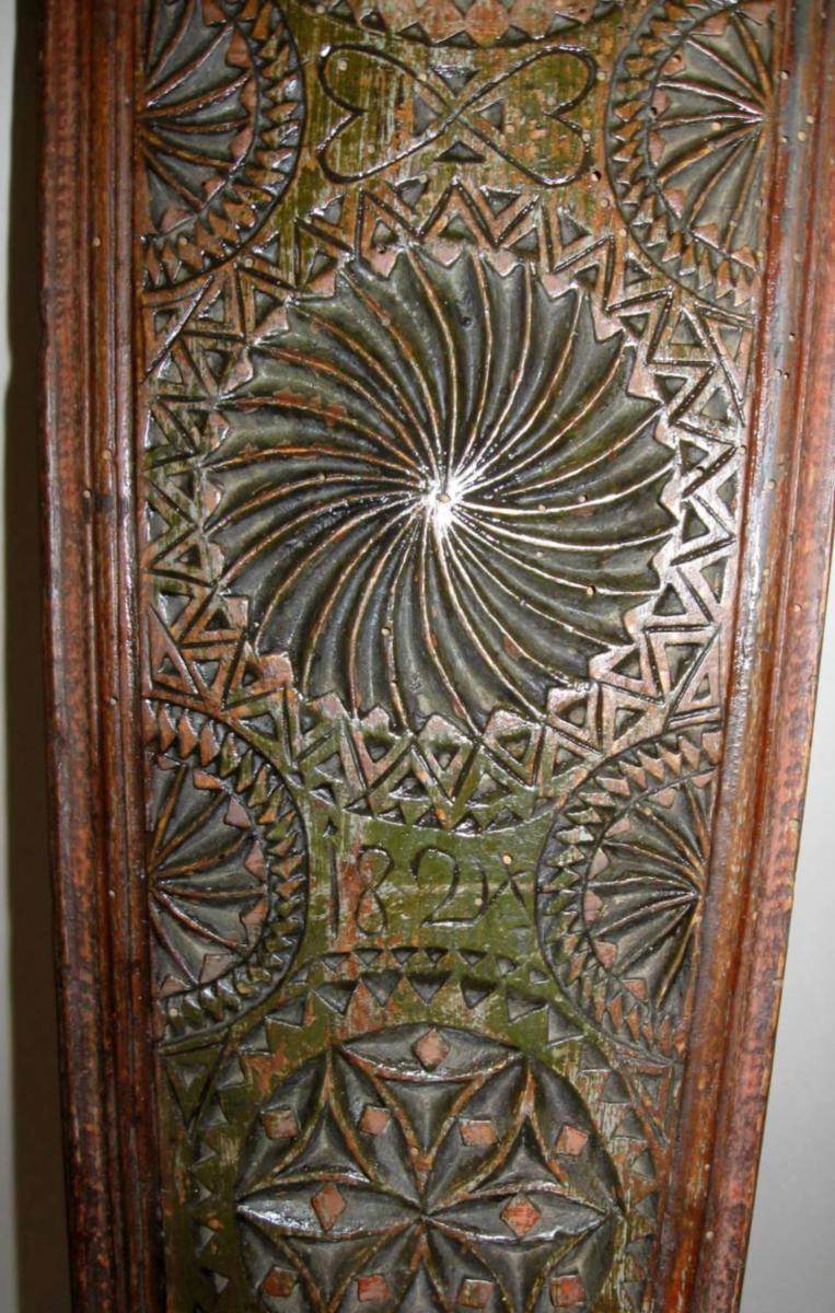 Dänisches Washbrett, 19. Jh. Mit Pferden Griff. Datiert 1824. Grün und rot lackiert. L:. 61 cm. Mit Reparatur. Provenienz:. Jütland.