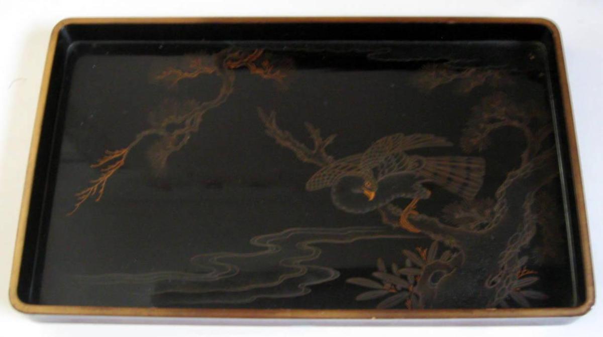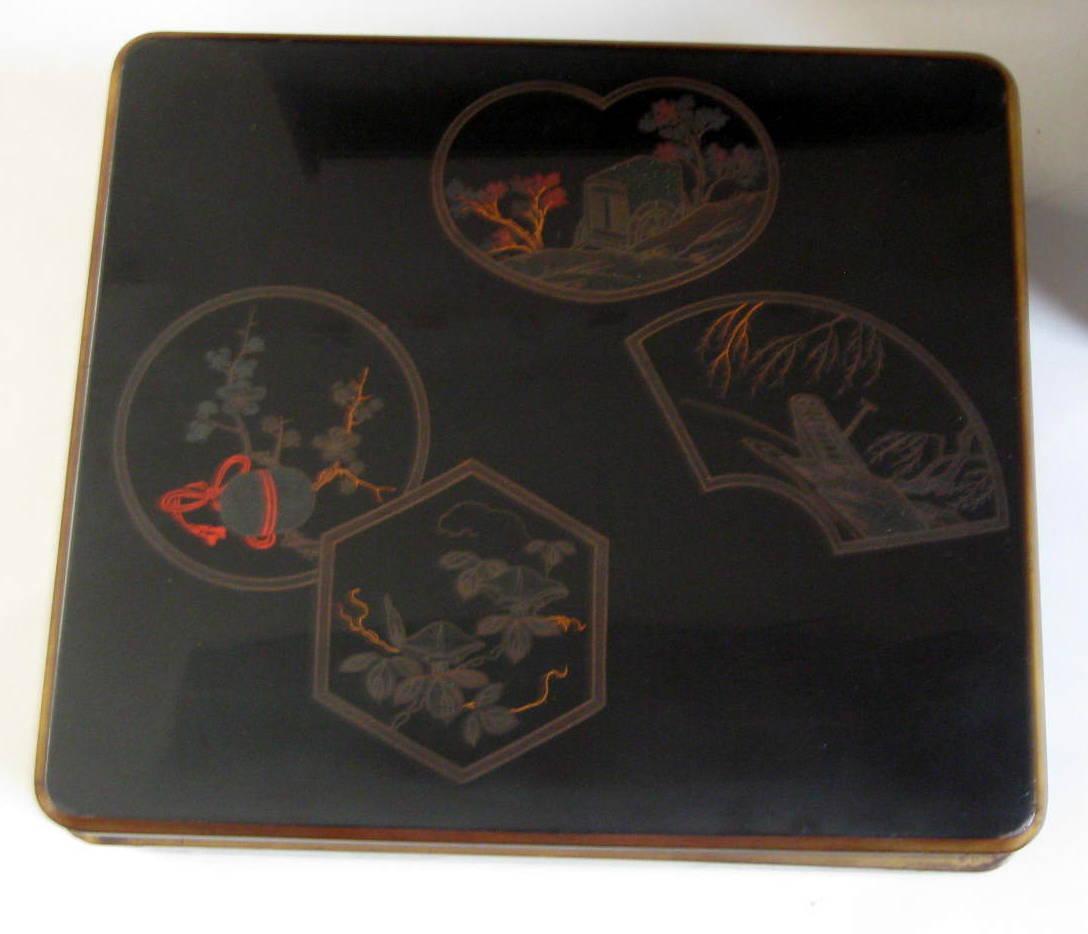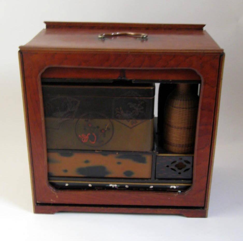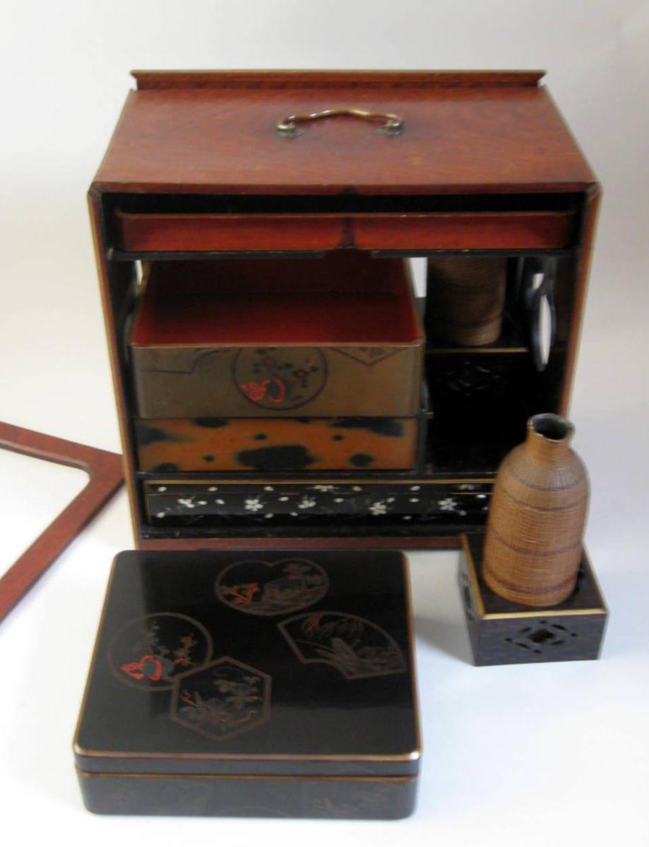 Japanisches Picknick Lackkasten, ca.1900. Es besteht aus einem Tablett, 3 Kasten, die eine enthält 12 kleinere Kasten die weniger rot sind. Dazu kommt ein großes sechsseitiges Tablett und ein Raum für Essstäbchen. Es gibt auch einem größeres Tablett mit Raster und Deckel mit Malerei auf Seide. Sie sind Alle dekoriert. Außerdem gibt es ein paar Bast Porzellan Flaschen für Sake. Die Kaste ist mit Tragegriff und abnehmbarer Front und die Seiten sind mit Obstmotiven geschnitten. Sobald die Seiten nach unten sind, können die Kasten nicht herausfallen. Alle Kasten sind interne rot lackiert. H:. 31 cm. B:. 33 cm. D:. 20,5 cm. Provenienz: HP Hanssen (1828 - 1912), war der Onkel von Hans Peter Hanssen, auch HP Hanssen Nørremølle genannt, der eine Sønderjysk Politiker und Organisator der dänischen Bewegung war, in der Zeit wo Jütland Deutsch was. H .P. Hanssen hatte eine Handelsfirma in San Francisco, USA, aber hat alles in dem Großen Feuer von 1849 verloren. Dann ist er nach Shanghai gereist, wo er Partner in der Firma Dent & Co wurde. Er lebte in Shanghai zwischen ca. 1850 -1870. Er ist nach London gereist, wo er begraben ist. Der Kaste ist an die dänischen Familie gebracht.